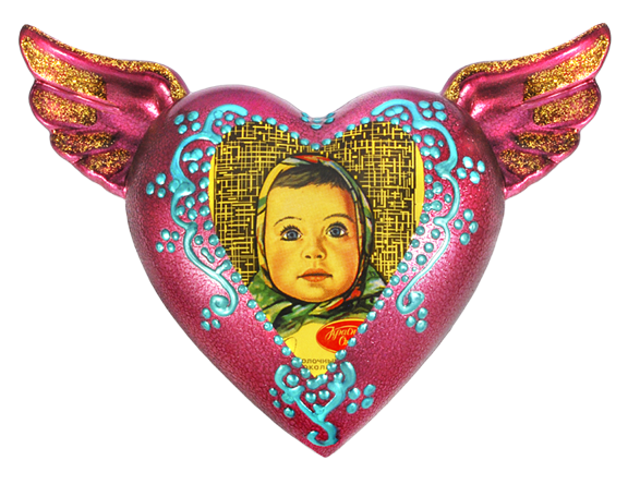 Keramikherz mit Applikation von nostalgischem Bonbonpapier und dekorativen Ornamenten. Handbemalt, beklebt und klarlackiert. Abmessungen ca.: H 10 x B 14 x T 3,5 cm Versand 4,00 Euro