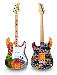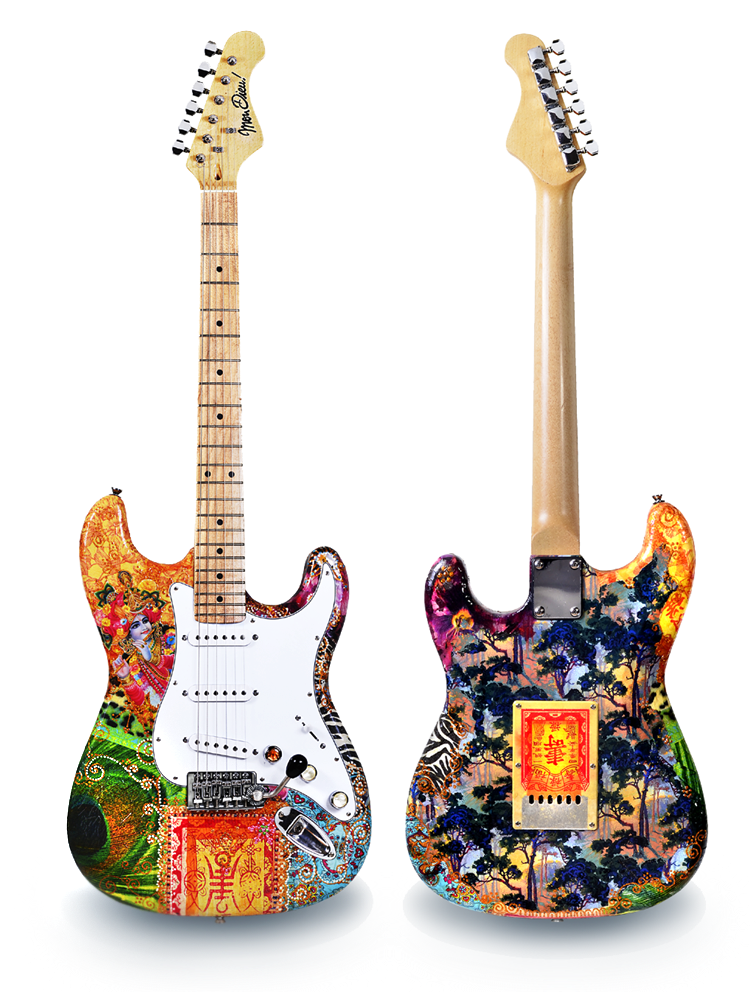Die in leuchtenden Farben schwelgende Gestaltung steht hier im Zeichen des flötenspielenden Krishna (links oben). Wenn Sie mehr über die ausserordentlichen Stromgitarren von MonDieu! erfahren wollen, lesen Sie die Infoseite am Ende dieser Rubrik.