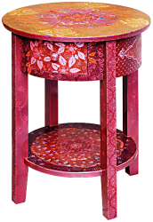 Rotmetallic in stämmiger Ausführung, mit floralen Dessins und einer kleinen Schublade. Gut geeignet für etwas massivere Ausstellungsstücke wie Planetengetriebe oder Basaltblöcke.