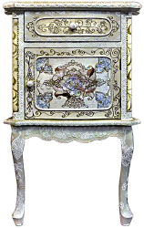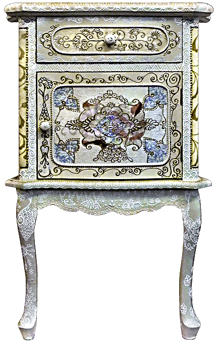 Reichverzierte Kommode, gehalten in Buttercreme-Valeurs und somit bestens als Zierde des Salons für die gehobene Kaffeegesellschaft geeignet. Versand 15,00 Euro