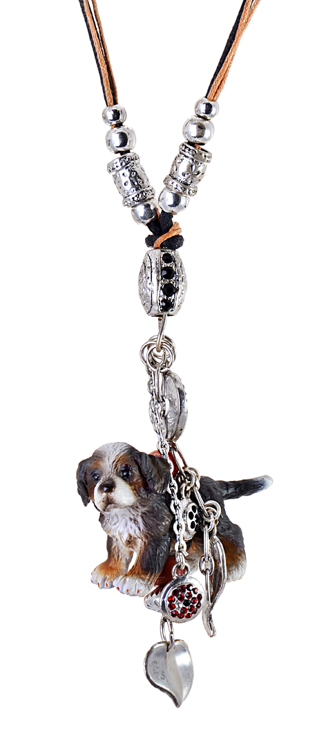 Der knuffige Kettenwelpe kommt an dreifacher, mit klimperndem Allerlei bestückter Leine zu Ihnen.