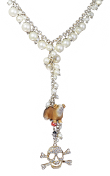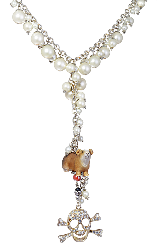 Perlenbestückte Kette mit lotgerecht zentriertem Anhängergebinde in Gestalt eines u.U. nicht ganz ungefährlichen Schildpattmeerschweinchens.