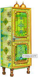 Grüße aus dem Morgenland: Vergoldete Halbkugeln aus massivem Buchenholz verleihen diesem Schrank eine mongolische Note. Wer in diesem Organisationsmöbel seine Siebensachen verstaut, hat immer genug Platz - selbst in der kleinsten Jurte!
